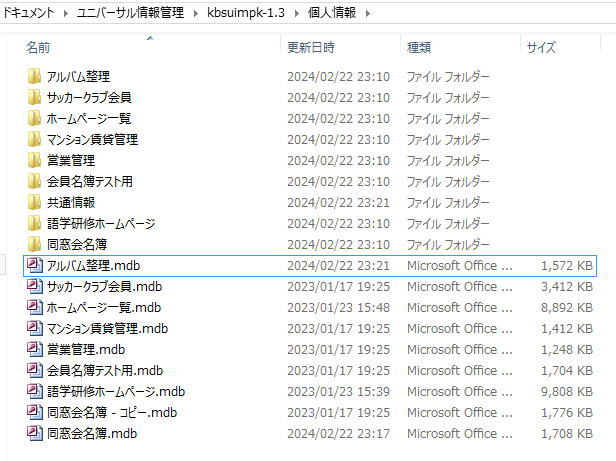 個人情報フォールダ内見本DBファイル アルバム整理.mdb サッカークラブ会員.mdb ホームページ一覧.mdb 営業管理.mdb 会員名簿.mdb ※見本ファイルは随時更新しています